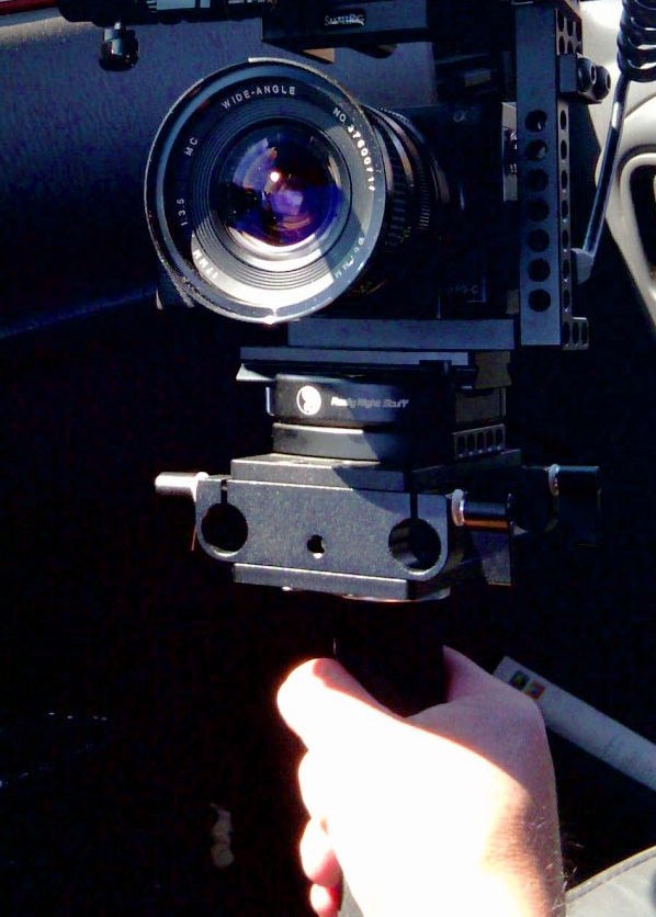 It was shot primarily with an FD 28-85mm f/4, an FD 35-105mm f/3.5, and a Pentax-K 17mm f/3.5 prime. The 28-85mm was used for most of the shoot. It proved a workhorse. The Pentax 17mm was used during traveling, hand-held work, and coupled with a Zhongyi Lens Turbo II, PK-NEX mount, was a stop faster and almost full frame. The rig was similar to the photo on the right.